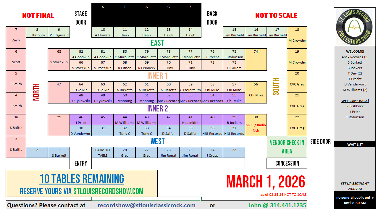 Starting with the January, 2024 show, The Society has begun to curate, organize, and run The. St. Louis Record Collectors Show at the American Czech Hall and with this endeavor, the Society's mission - "to preserve, promote and honor St. Louis' unique classic rock heritage and its place in music and pop culture history" - has never been stronger.